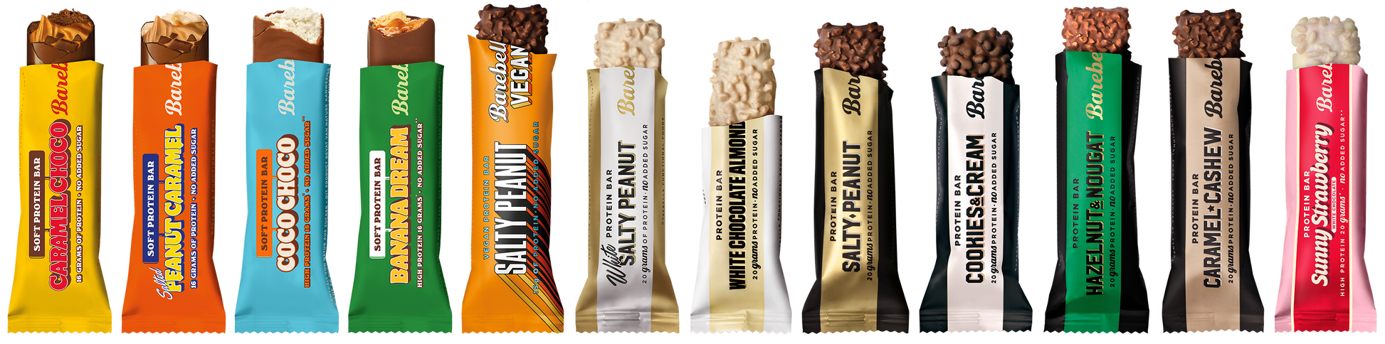 Caramel-Cashew: Milchprotein, Feuchthaltemittel: Glycerin, Milchschokolade (16%) (Süßstoffe: Maltitol, Kakaobutter, Vollmilchpulver, Kakaomasse, Emulgatoren: Sojalecithine, Aromen), Isomaltooligosaccharide, Kollagenpeptide, Kokosflocken (6%), Wasser, Sojaprotein (Sojaproteinisolat, Tapiokastärke, Salz) , Palmfett, Aromen, Süßstoffe: Sucralose, Acesulfam K.