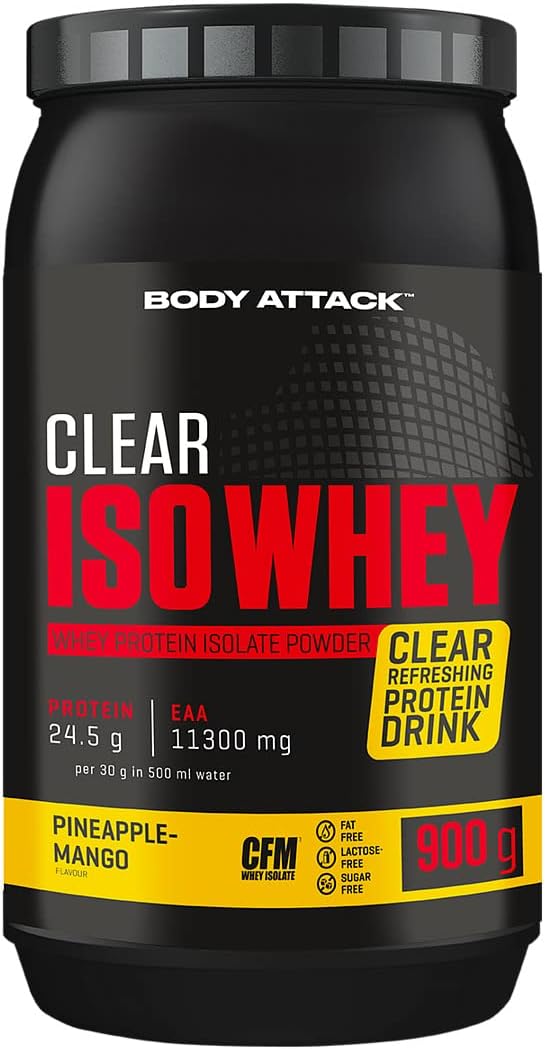 Clear the way! Es wird Zeit für eine Protein-Evolution in deinem Shaker! Das CLEAR ISO WHEY Pulver von BODY ATTACK liefert dir die erfrischende Alternative zu klassischen Proteinshakes! Teste eine von 6 fruchtigen Sorten und finde deinen Favoriten. Mit ca. 25 g Protein* und starken 11.400 mg EAAs* pro Portion (30 g) bist du bestens für effektiven Muskelaufbau** vorbereitet! Gib deinem Körper nach deiner besten Performance die Bausteine, die er zum Aufbau benötigt. Mit jedem durstlöschenden Shake bekommst du klares, hochwertiges CFM-Molkenprotein-Isolat. Auf Zucker, Fett und Gentechnik verzichten wir – deine Performance bleibt auf höchstem Niveau!