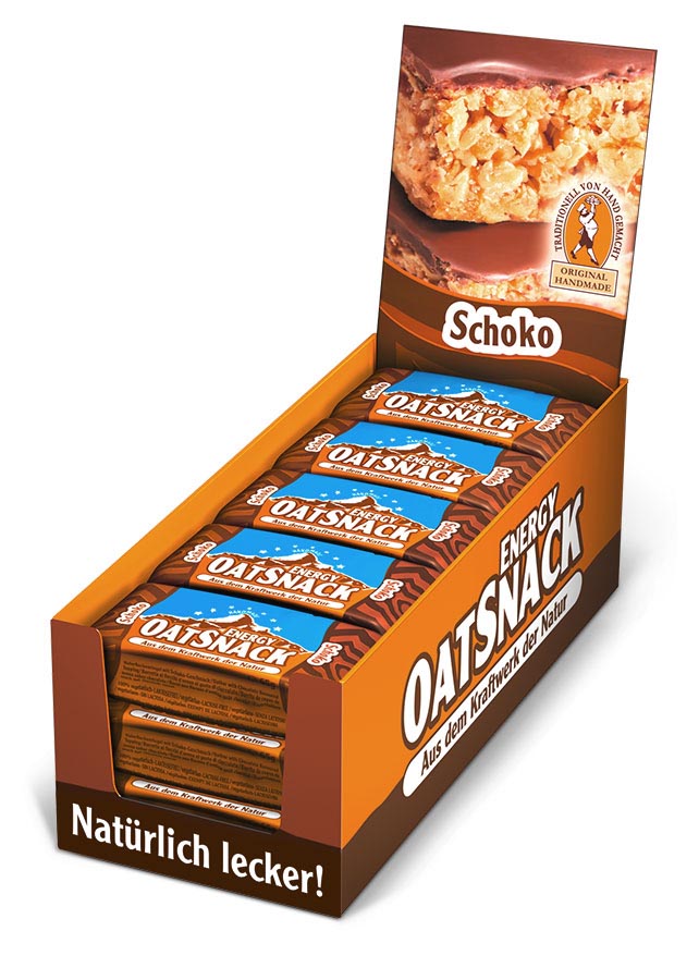 Haferflocken bilden die Basis für den Energy OatSnack, der je nach Geschmacksvariation mit ausgewählten Zutaten wie Früchten, Nüssen oder Kokosflocken verfeinert wird. Der Riegel sorgt auch ohne Topping für ein leckeres Geschmackserlebnis. Der ideale Snack für zwichendurch.
